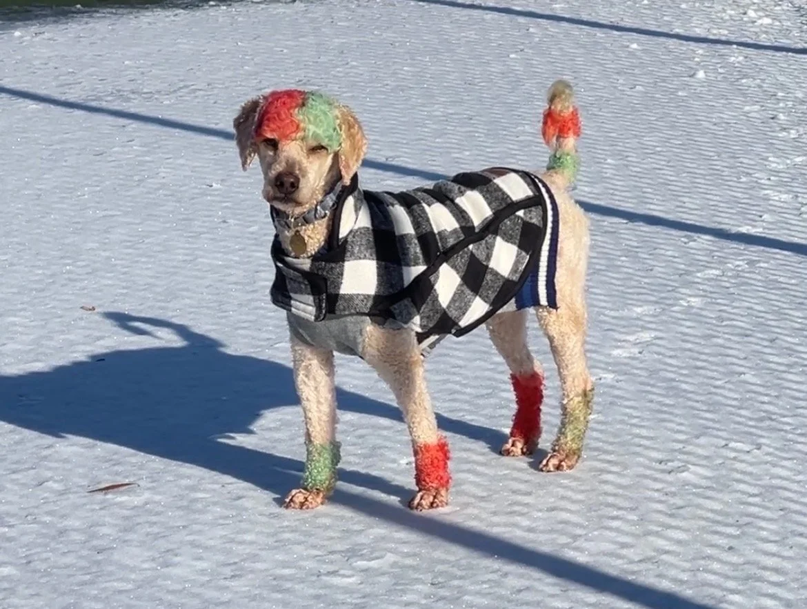 Hat tip to our wonderful groomer Tina for the Christmas colors for Andy.